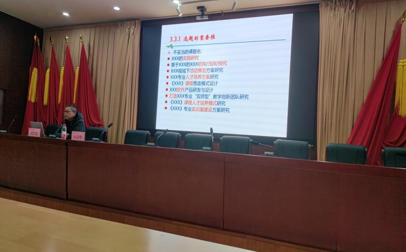 2024年1月22日,我校举行“加强有组织科研,提升科研能力”系列培训会举行第一讲,特邀长沙商贸旅游职业技术学院胡伏湘教授作为主讲嘉宾,系统讲解“高职教师教育科研课题申报的选题、方法与技巧”。讲座由科研与社会服务处处长成奋华教授主持。预备申报2024年度省教育科学规划课题的老师、在研校级及以上科研项目在研的项目负责人、近3年新入职的专任教师及辅导员、二级学院分管科研工作的副院长等一百余人参加了讲座。
