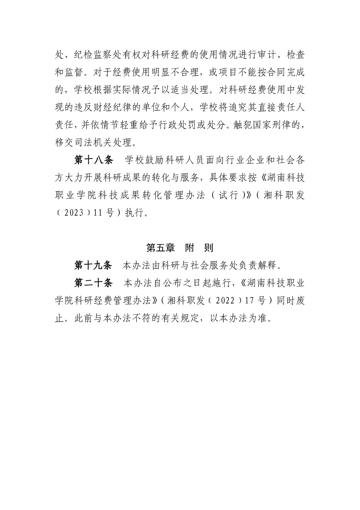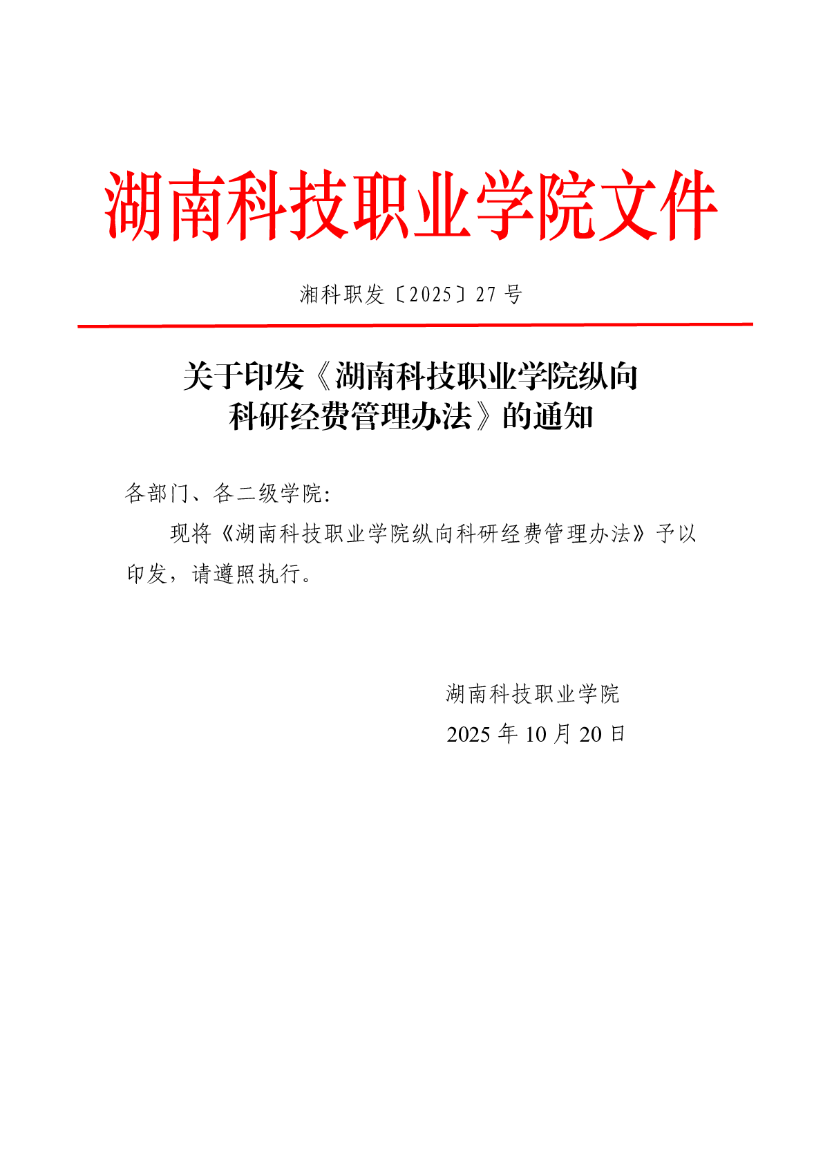 关于印发《湖南科技职业学院纵向科研经费管理办法》的通知